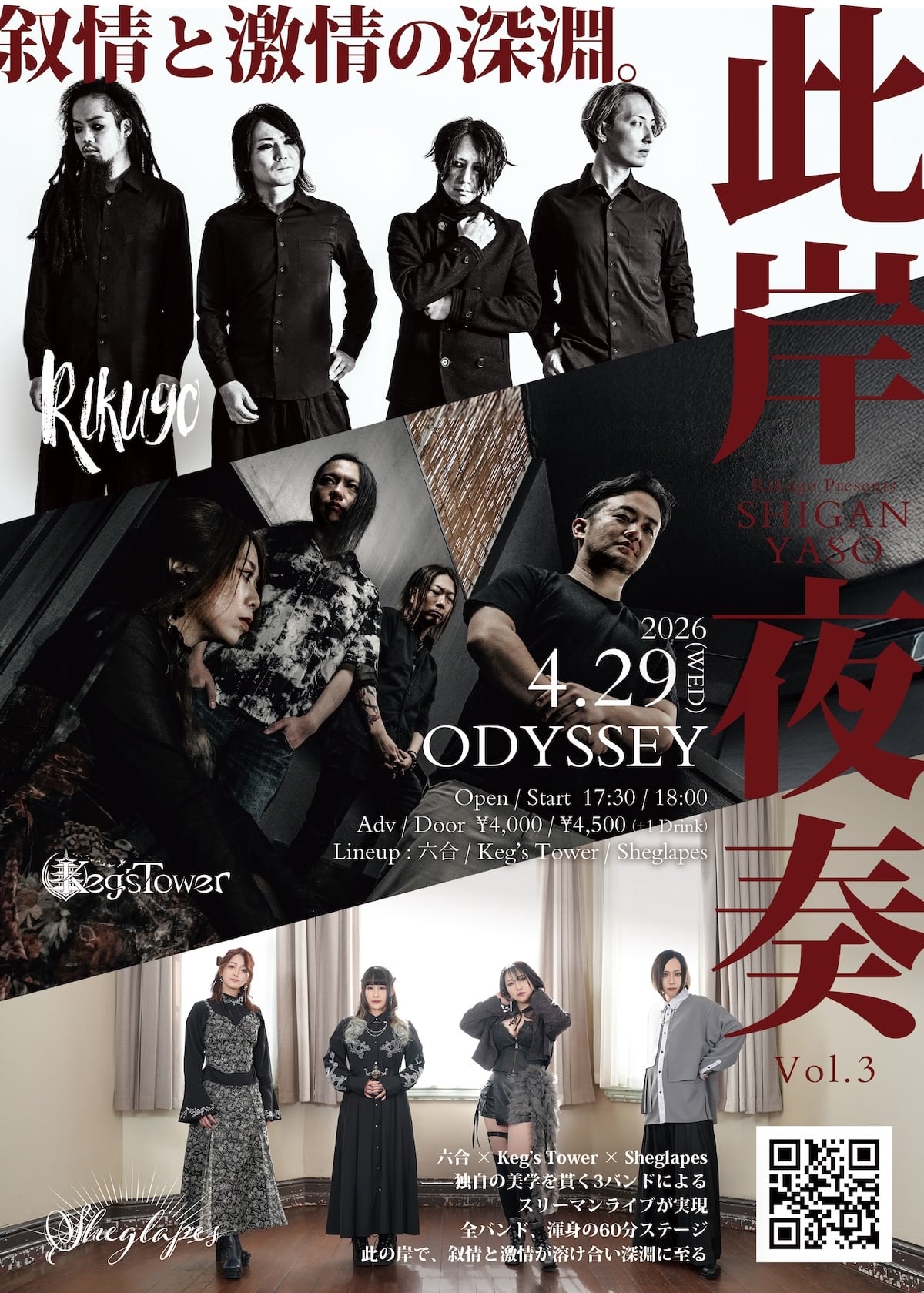 六合 × Keg’s Tower × Sheglapes——独自の美学を貫く3バンドによるスリーマンライブ「此岸夜奏 -SHIGAN YASO- Vol.3」開催を記念した限定Tシャツです。